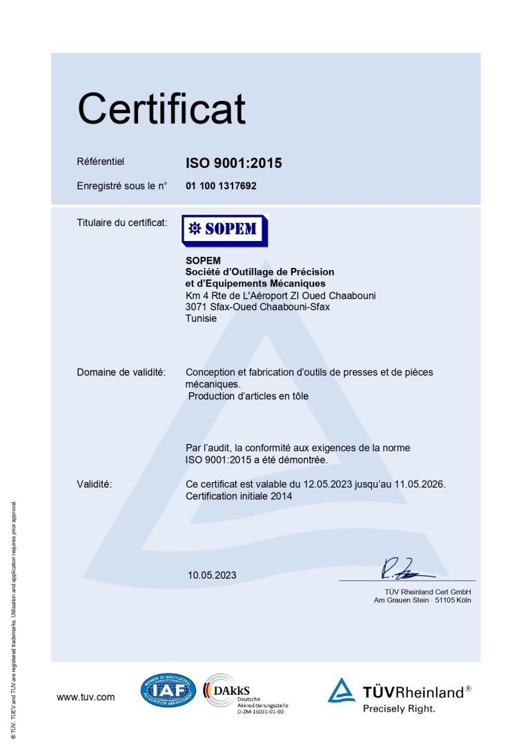 La Société d’Outillages de Précision et d’Equipements Mécaniques (SOPEM) désire être reconnue par ses clients comme un partenaire de confiance qui livre des produits de qualité et assure l’amélioration continue de ses activités.